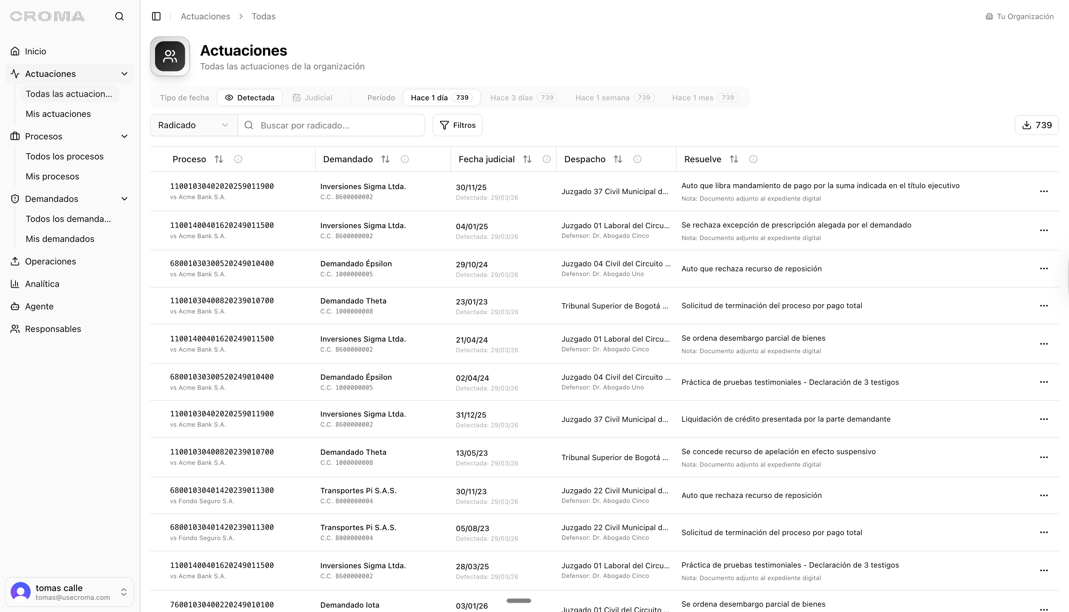 Sube tus radicados y Croma los cruza, resuelve identificadores y completa metadata faltante.