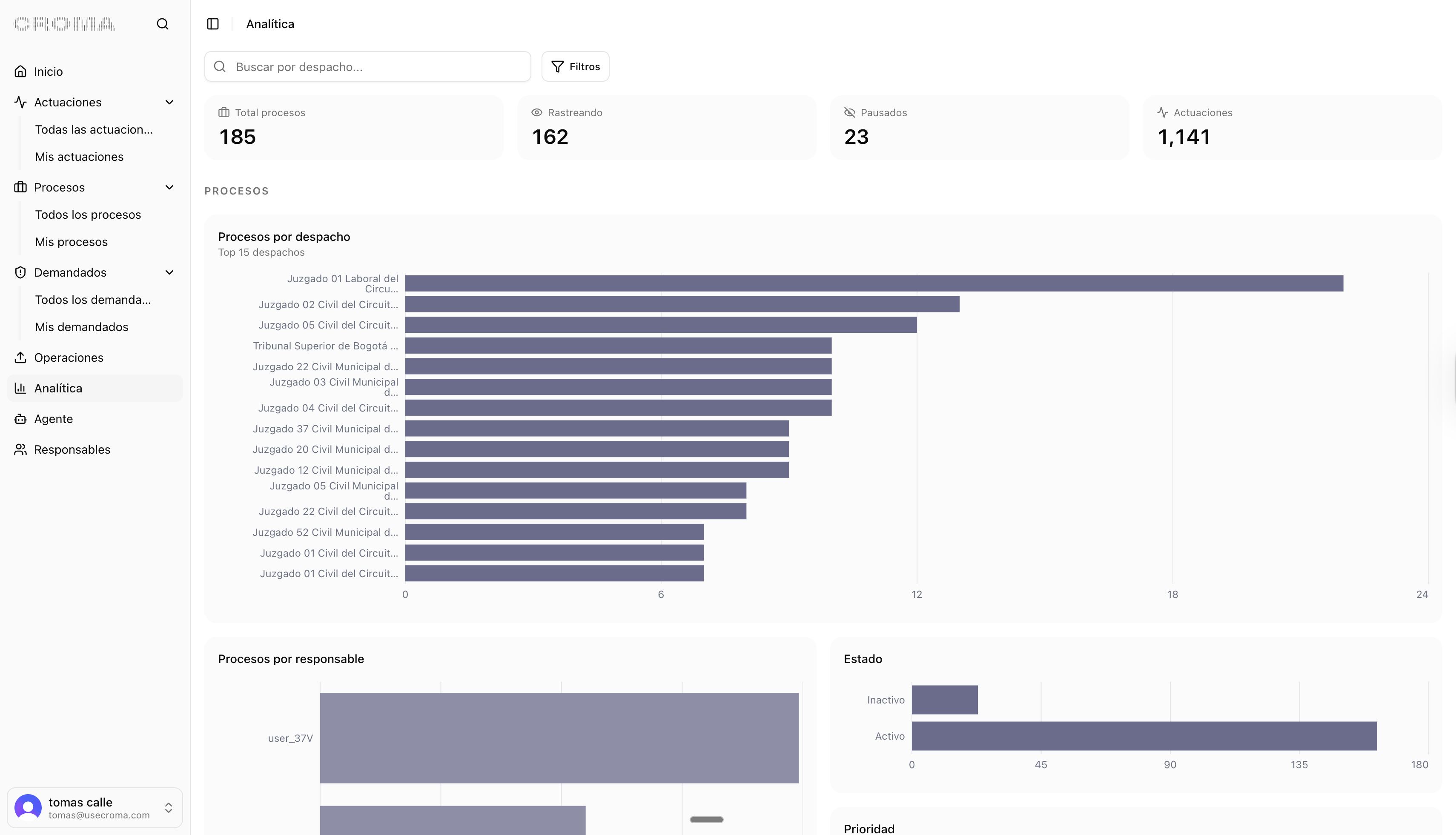 Procesos por despacho, responsable, estado y prioridad en un solo panel. Decisiones basadas en datos.